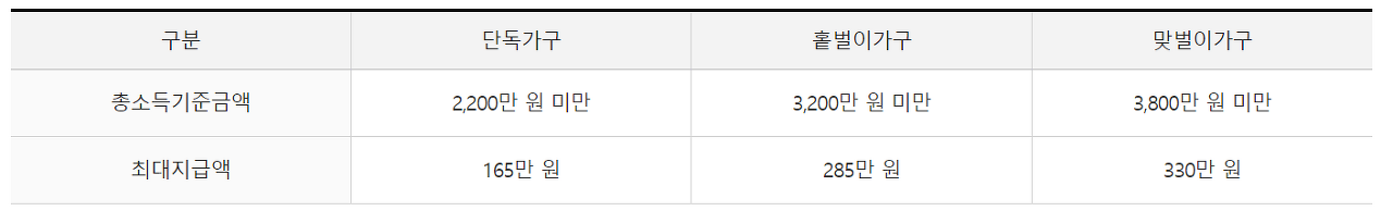 - 단독가구 : 총 급여액 400만원 ~ 900만 원 - 165만 원 (최대) 수령