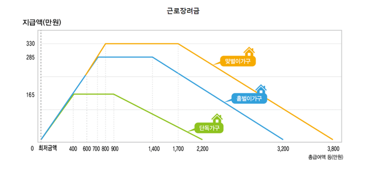 - 맞벌이가구:총 급여액 800만원 ~ 1,700만 원 - 330만 원 (최대) 수령