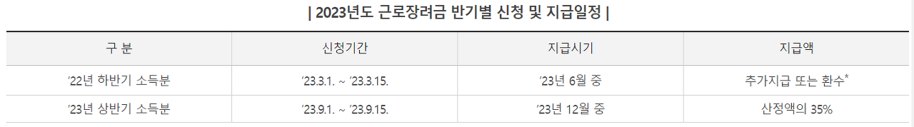 - 23년 반기신청 : 23년 9월 1일 - 15일 사이 신청, (지급일은 23년 12월), 지급액은 산정액의 35%